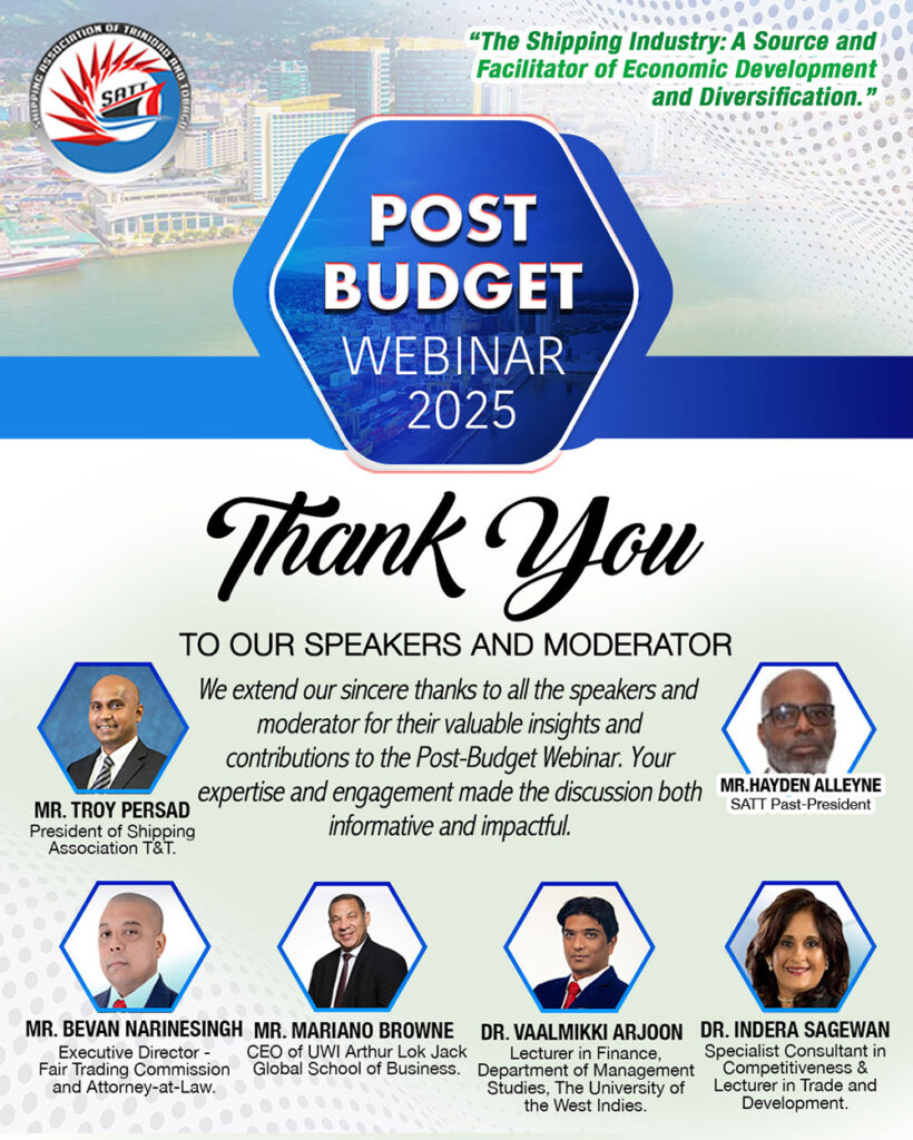 The Post Budget Webinar 2025, hosted by the Shipping Association of Trinidad and Tobago (SATT), was held on Thursday, October 23rd, 2025, from 9:00 AM to 12:00 PM via Zoom.